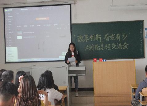 物理系学生党支5月7日下午两点四十在综A-410教室召开“改革创新,奋发有为”大讨论总结交流会。参加会议的有:学生党支部书记杨艳及在校党员、预备党员和发展对象。本次会议分团委副书记贺斌主持,此次会议以观看视频为辅,交流总结为主的形式开展。