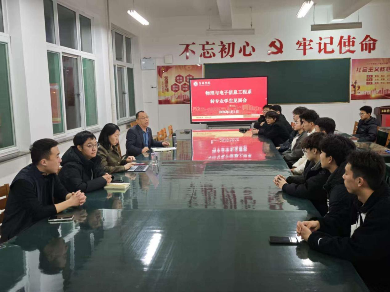 春启新章,逐梦同行。为帮助转专业新生快速融入物电系大家庭,明晰学业方向、筑牢成长根基,3月1日,tyc8722太阳集团在弘博楼A-408召开转专业新生见面会。系主任王丽华、副主任王晓军出席会议,全体转专业新生、转入班级辅导员及班级学习委员参会。