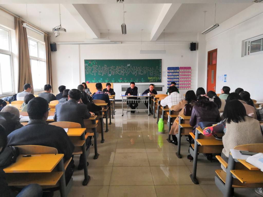 物理系党总支于2019年3月19日下午两点四十在综A-409教室召开“改革创新,奋发有为”大讨论研讨会。参加会议的有:太阳集团城娱8722副院长刘宝琦,校团委副书记师辉辉,党总支副书记王秀芬、副主任(主持)雒卫廷、副主任白心爱、、物理系全体教职员工及学生代表。