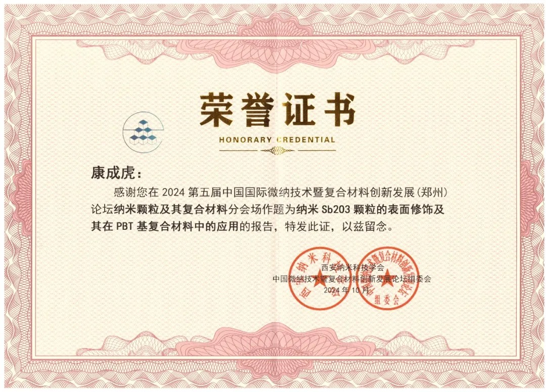 我系康成虎博士参加会议并作题为“纳米Sb2O3颗粒的表面修饰及其在PBT基复合材料中的应用”分会邀请报告,从“复合材料研究背景”、“纳米Sb2O3颗粒表面的吸附改性研究”、“纳米Sb2O3颗粒填充PBT基复合材料的力学性能研究”、“纳米Sb2O3在PBT基复合材料中的分散性定量评估”、“纳米Sb2O3颗粒填充的PBT基复合材料阻燃性能的研究”五个方面介绍了自己的科研进展情况,并与相关专家进行了深入交流。