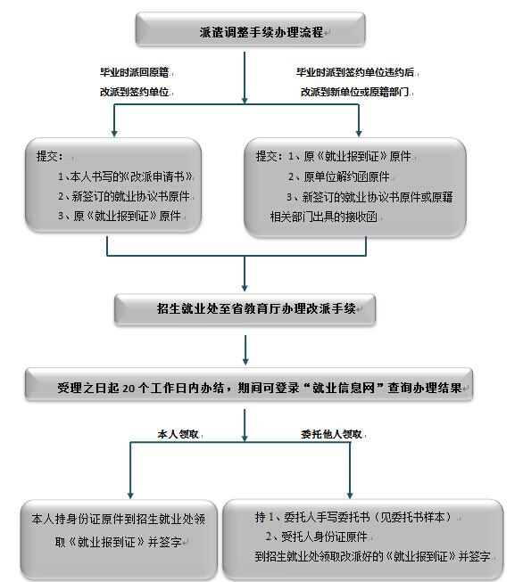 4、毕业时有具体就业单位,违约后要求回原籍者,来校办理时需提交《就业报到证》、原籍教育或人才部门出具的接收函、《派遣调整申请书》(样本见附件)。