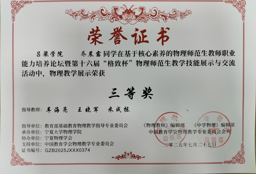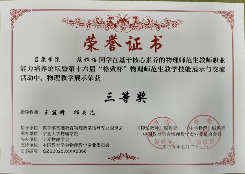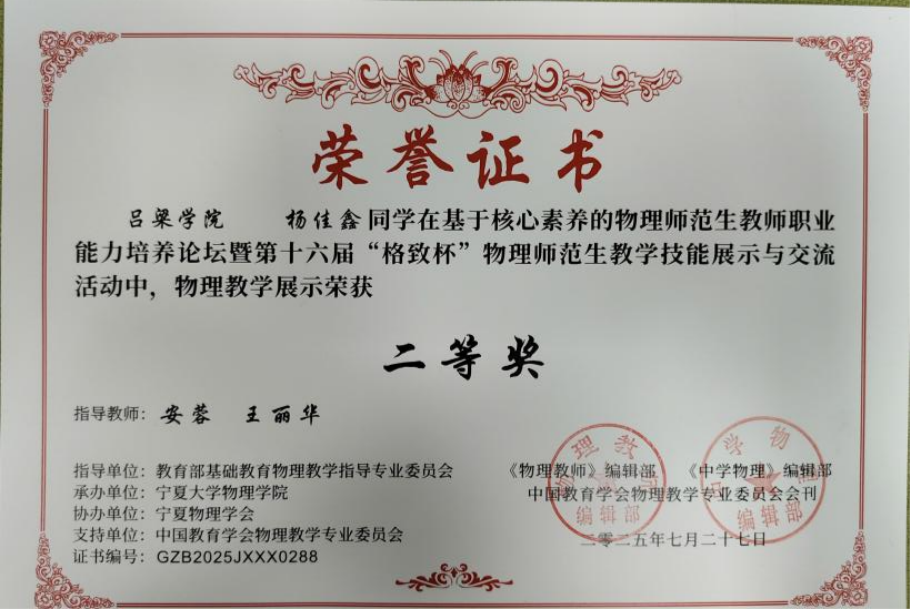盛夏传捷报,赛场展风采!7月25日至27日,第十六届“格致杯”物理师范生教学技能展评活动在宁夏大学圆满落幕。我系段梓怡、乔晨露、杨佳鑫3名学子在王燕锋、车海亮、安蓉等指导教师的带领下,与来自全国117所高校的1400余名选手同台竞技,最终斩获二等奖1项、三等奖2项,以实力彰显我系物理师范生培养的扎实成效!