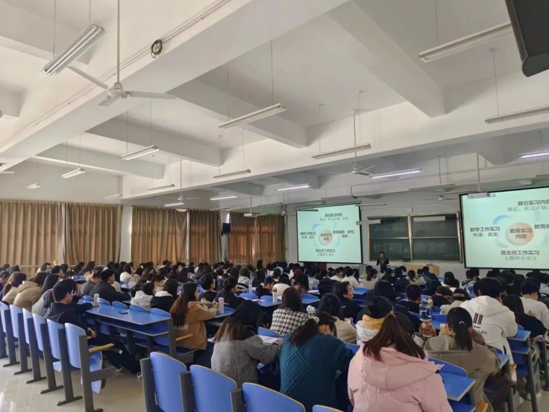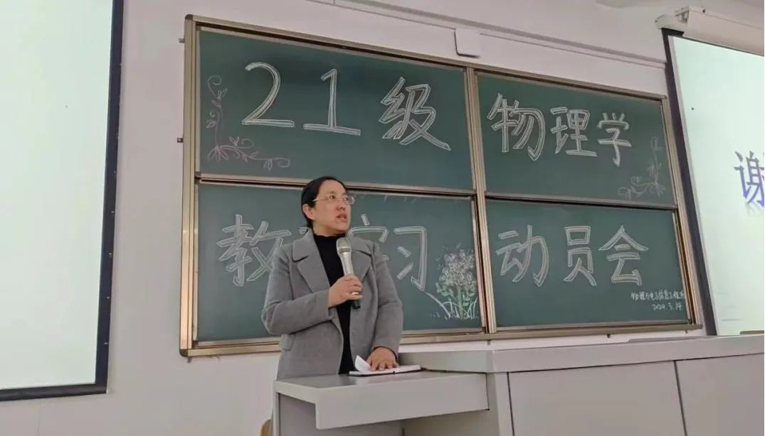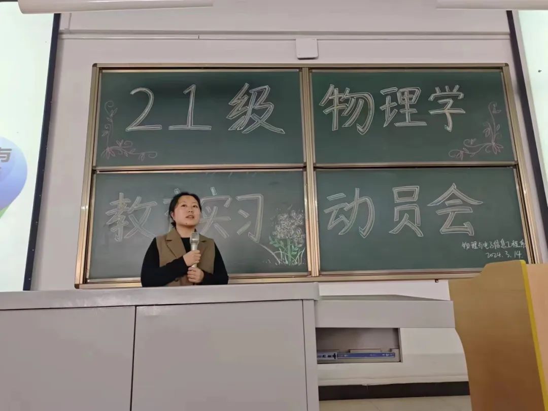 为扎实做好2021级物理学专业教育实习工作,进一步提高物理学专业师范生的教学能力、实践能力和综合素质。3月14日下午,tyc8722太阳集团2021级物理学专业学生实习动员大会在弘博楼B阶-203召开。系主任白心爱、21级物理学专业班主任车海亮、李丽、13名实习指导教师以及165名学生参加了此次会议。会议由车海亮老师主持。