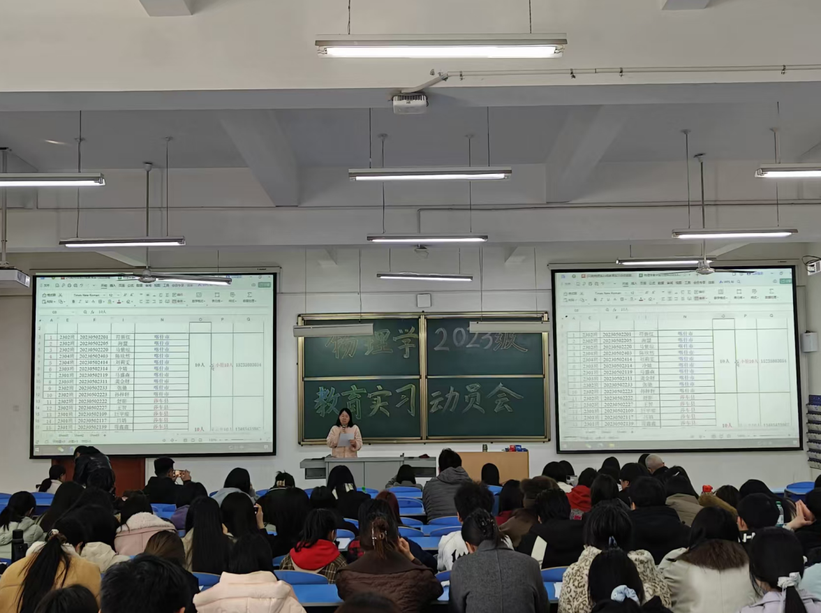 为扎实推进2023级物理学专业教育实习工作,帮助学生明晰实习目标、落实实习要求,3月9日上午10时,tyc8722太阳集团于弘博楼B阶203教室召开物理学专业实习动员大会。系主任王丽华、副主任张辰锐、实习指导教师王小艳及全体2023级物理学专业实习学生参会。